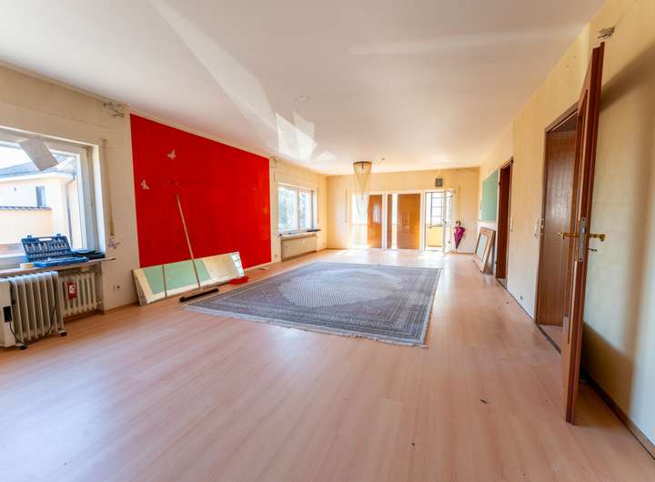 Die Wohnung im Erdgeschoss ist ausgestattet mit einem Flur, einem sehr großen Wohnbereich mit Wintergarten, einer Küche, einem Schlafzimmer, einem Büro, einem Badezimmer mit Badewanne und Dusche sowie einem separaten Gäste-WC. Vom Wintergarten aus hat man direkten Zugang zur Garage und in den Keller. Bei dieser Wohnung sind Renovierungen erforderlich.
