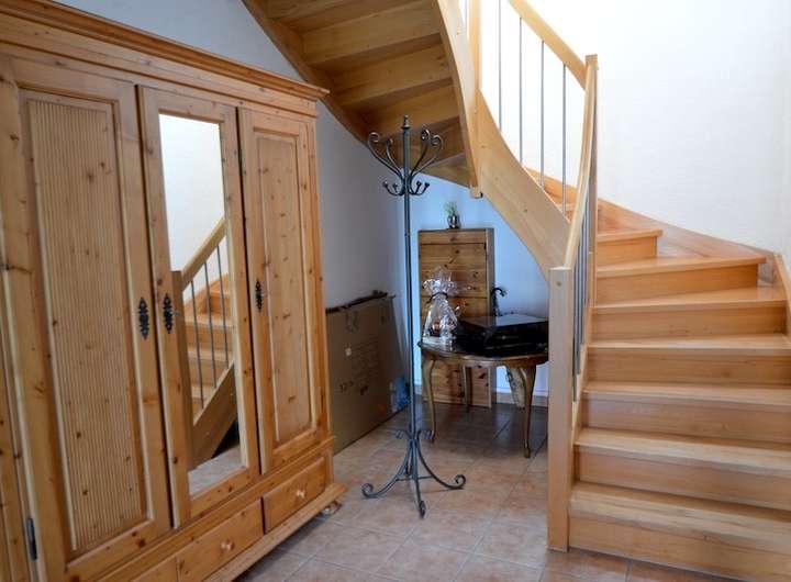 Im Hanggeschoss empfängt Sie ein großer Eingangsbereich, der mit einer geschmachvollen Treppe ins Obergeschoss führt. Der Eingangsbereich ist geräumig gestaltet und verfügt über ausreichend Platz für einen Garderobenschrank, Schuhschrank, etc.