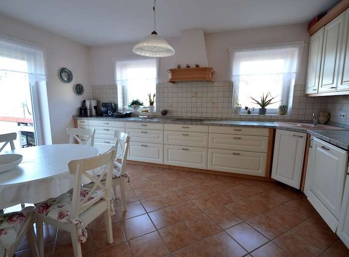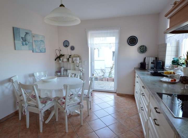 Auf gleicher Ebene befindet sich die großräumige Küche, in der Sie nicht nur kochen, sondern auch gemütlich essen können. Die Terrasse ist direkt von der Küche aus zugänglich, ideal für das gemeinsame Frühstück oder gesellige Abende bei einem Glas Wein.