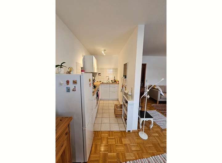 Die Einheit im OG rechts bietet einen Flur, ein helles Wohnzimmer mit offener Küche und Balkonzugang, ein Schlafzimmer, ein innenliegendes Badezimmer mit Dusche und eine Abstell-/Garderobennische. Die Bodenbeläge bestehen aus Parkett, Laminat und Fliesen.