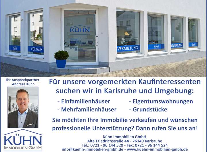In kurzer, fußläufiger Entfernung befindet sich die Straßenbahnhaltestelle „Rösselsbrünnle“ der Linie S2 mit Verbindung in die Karlsruher Innenstadt. In wenigen Fahrminuten mit dem Pkw erreichen Sie außerdem die Stadt Ettlingen sowie über die B36 die Stadt Rastatt.
