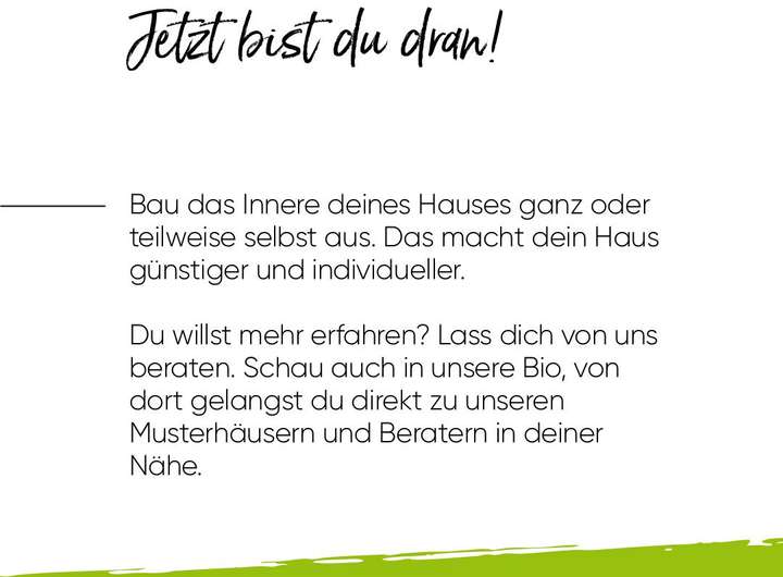 Entdecken Sie die vielseitigen Gestaltungsmöglichkeiten und die hohe Qualität unserer Ausbauhäuser. Nutzen Sie die Gelegenheit, sich von den flexiblen Grundrissen und den individuellen Anpassungsmöglichkeiten zu überzeugen. Unser Ziel ist es, Ihre Wohnträume zu verwirklichen und Ihnen ein Zuhause zu bieten, das perfekt zu Ihnen und Ihrer Familie passt.