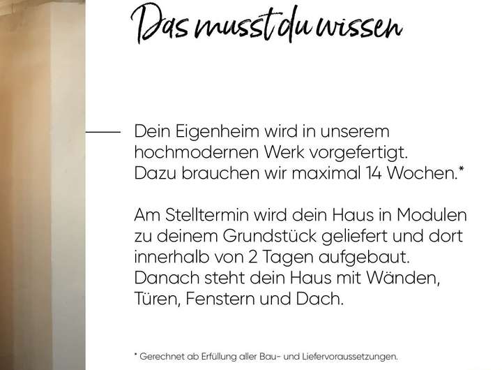 Hinweis: Die abgebildeten Innen- und Außendarstellungen sowie Sonderausstattungen dienen lediglich der Veranschaulichung und können von der tatsächlichen Ausführung abweichen. Der angegebene Preis versteht sich exklusive der in den Beispielbildern gezeigten Sonderausstattungen. Die Konfiguration deines Traumhauses erfolgt individuell und kann an dein Budget und deine Wünsche angepasst werden.