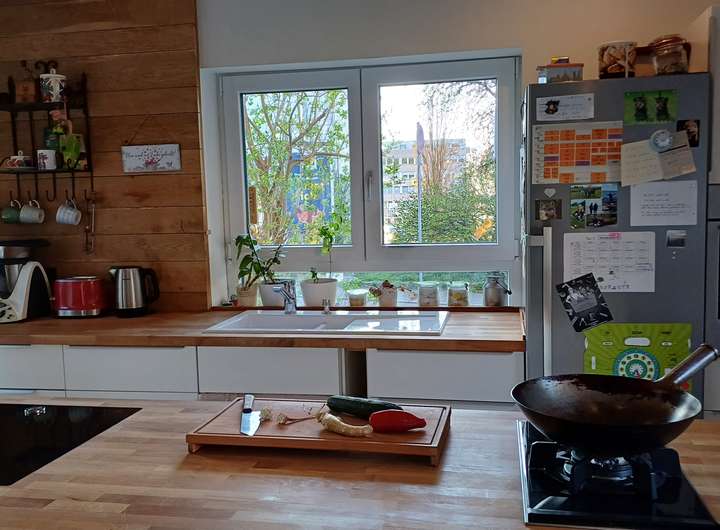Durch die schöne Kücheninsel aus massivem Holz inkl. Gaskochfeld für einen Wok und hochwertigem Induktionskochfeld von Neff können Sie sich beim Kochen jederzeit mit Ihren Gästen weiter unterhalten.