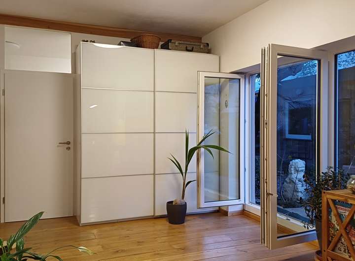 Im UG ebenerdig eine große Wohnküche. Viel Licht durch viele, hohe Fenster. sowie 1 Badezimmer. Zuzüglich einen großen, optisch dezenten Einbauschrank.