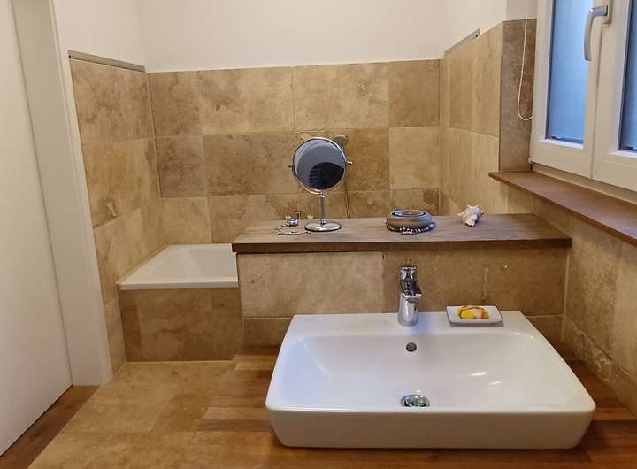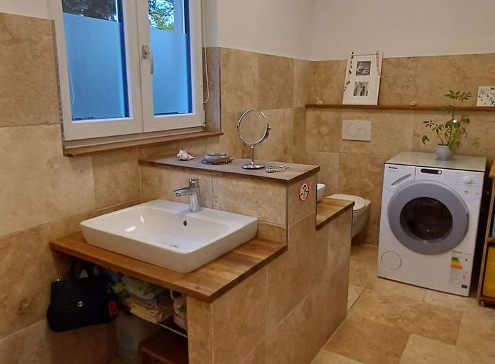 Das Badezimmer im UG verfügt über eine mit Badewanne mit Dusche sowie zwei Waschbecken und Platz für eine Waschmaschine.