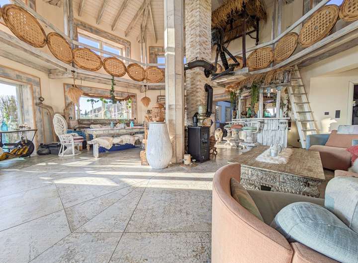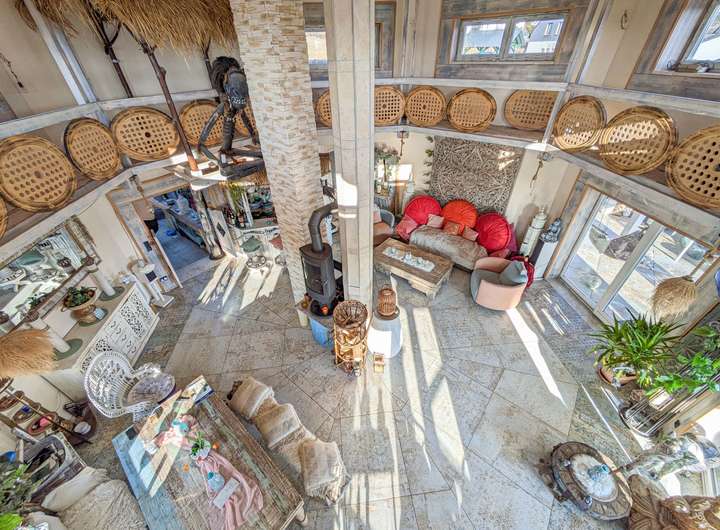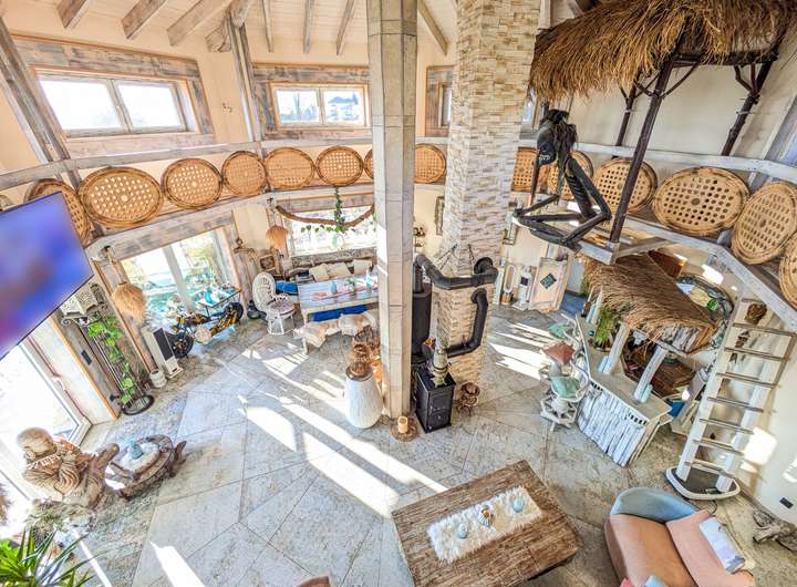 - Offenes Wohnkonzept mit hohen Decken und rustikalen Holzelementen
