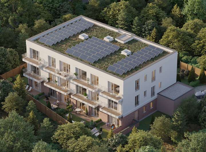 In der idyllischen Gemeinde Hoppegarten unweit der Galopprennbahn entsteht mit der Rennbahnallee 103 ein exklusives Wohnensemble mit 12 hochwertigen Eigentumswohnungen. Das moderne dreigeschossige Mehrfamilienhaus beeindruckt durch seine durchdachte Architektur und die harmonische Integration in die grüne Umgebung. Besonders angenehm ist die Lage in zweiter Reihe, die für zusätzliche Ruhe und Privatsphäre sorgt – weit weg vom Straßenlärm, aber dennoch perfekt angebunden. Die großzügigen Verglasungen und die Südwest-Ausrichtung garantieren lichtdurchflutete Räume und ein angenehmes Wohnambiente. Das nachhaltige Gebäude wird nach dem zukunftssicheren KfW-55 EE Standard errichtet und verfügt über eine eigene Photovoltaikanlage. Diese Kombination aus hochwertiger Immobilie und niedrigen Energiekosten macht das Objekt ideal für anspruchsvolle Eigennutzer oder für Kapitalanleger, die auf Wertstabilität und Nachhaltigkeit setzen.