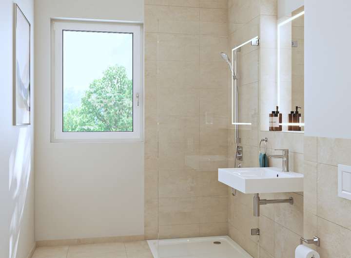 Das stilvolle Badezimmer mit edlen Feinsteinzeug-Fliesen, bodengleicher Dusche und modernen Armaturen bietet Komfort auf höchstem Niveau. Ein zusätzlicher Hauswirtschaftsraum mit Waschmaschinen-Anschluss schafft weitere Abstelloptionen.