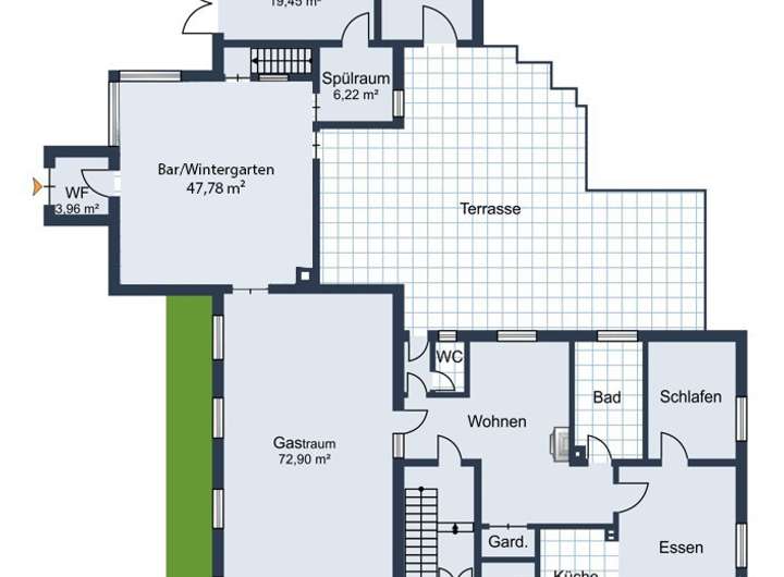 Gewerbeeinheit EG: Saal, Wintergarten, Bar, Nfl. ca. 135 m² (Diese könnte mit der Wohneinheit im EG auf ca. 235 m² erweitert werden)