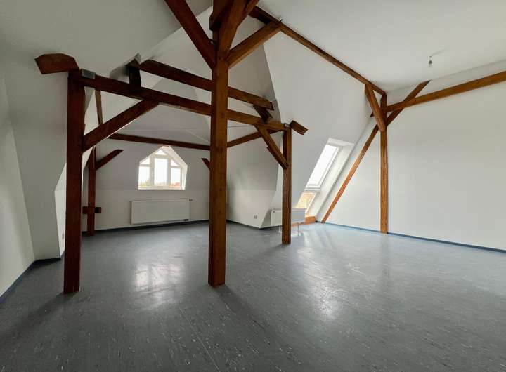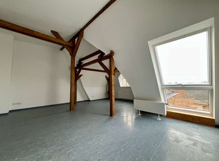 Auf 100 qm erwarten Sie sichtbare Holzbalken, große Dachfenster, viel Tageslicht & eine einladende Atmosphäre.
