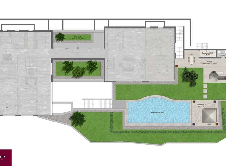 Die großzügige, professionell angelegte Gartenanlage bietet eine idyllische Rückzugsoase mit beleuchteten Gartenwegen, automatischem Bewässerungssystem sowie Wasserinstallationen. Weitläufige Terrassen mit insgesamt ca. 82,66 m² und atemberaubendem Panoramablick sowie drei Balkone mit insgesamt ca. 93,38 m² laden zum Verweilen ein, während eine luxuriöse Outdoor-Küche mit Grillstation und Steinofen das perfekte Ambiente für exklusive Events schafft. Ein überdachter Lounge-Bereich rundet das Outdoor-Erlebnis ab.