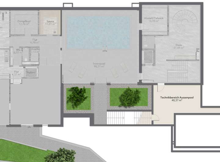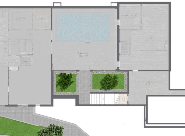 Diese Villa bietet einen großzügigen Wellnessbereich, der keine Wünsche offenlässt. Dazu gehören ein beheizter Außenpool mit Gegenstromanlage, ein exklusiver Indoorpool mit LED-Beleuchtung, eine luxuriöse Sauna, ein Dampfbad sowie ein Whirlpool mit Massagedüsen. Der private Ruheraum und eine Erlebnisdusche mit Regeneffekt bieten pure Entspannung in einem einzigartigen Ambiente.
