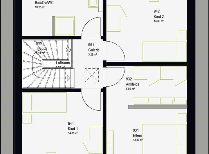 Im Dachgeschoss unter dem klassischen Satteldach finden Sie Ihr privates Reich. Der große Flur verbindet zwei Kinderzimmer und ein Elternschlafzimmer mit dem geräumigen Bad. Hier können Sie sich zurückziehen und entspannen.