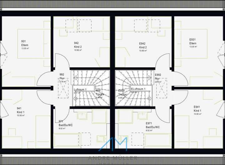 Die beiden Wohneinheiten sind spiegelbildlich angeordnet und können an die individuellen Wünsche der Baufamilien angepasst werden. Im Erdgeschoss befinden sich je ein offener Koch-, Ess- und Wohnbereich, ein Gäste-WC und ein Hauswirtschaftsraum, der von beiden Parteien genutzt werden kann. Die u-förmige Treppe führt in das obere Stockwerk, wo Platz für ein geräumiges Bad, mehrere Schlafräume oder Hobby- und Arbeitszimmer ist.
