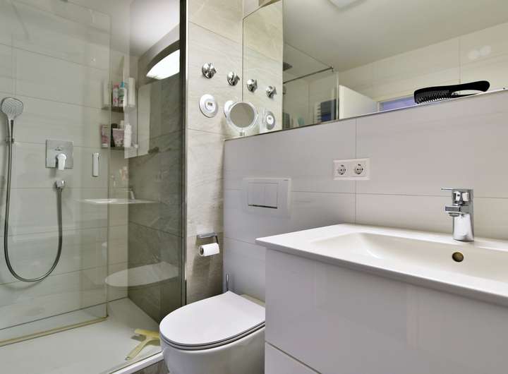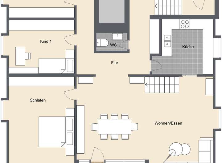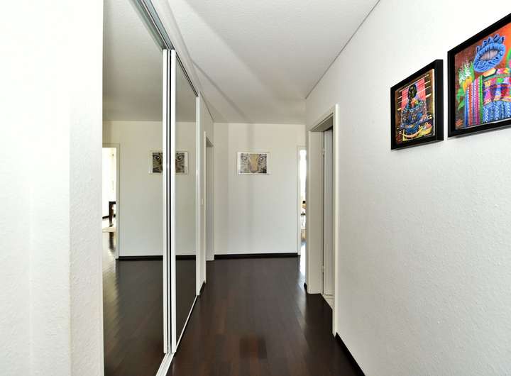 Auf der anderen Seite gelangen Sie in Ihr Badezimmer, ausgestattet mit Waschbecken, WC, Dusche und Wanne für gemütliche Winterabende oder um einfach gut in den Tag starten zu können. Ein zusätzliches, separates Gäste-WC ist gleich neben dem Eingang angesiedelt. Gegenüber befindet sich Ihr Schlafzimmer, welches direkt vom Wohnbereich erreichbar ist. Die beiden Kinderzimmer sind direkt vom Flur aus zugänglich. Tolle Orte um zu lesen, lernen oder sich einfach nur zurückzuziehen.