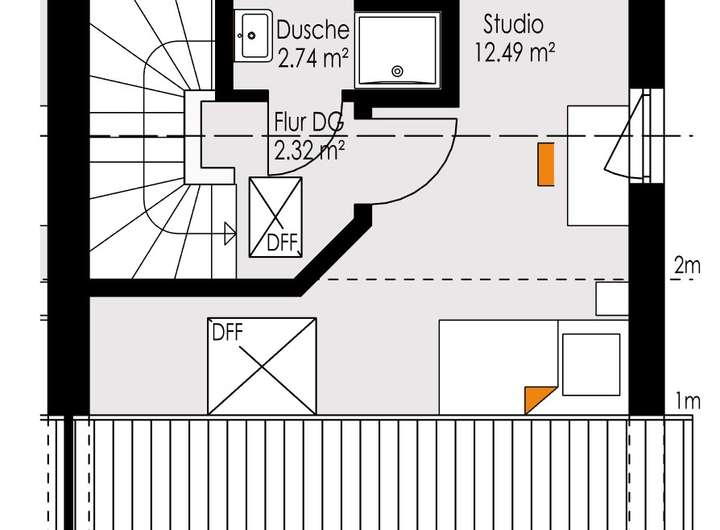 Eine tolle Erweiterung des Wohnens ist das ausgebaute Dachgeschoss. Das schöne Studiozimmer kann als Gästezimmer oder eigenes Reich für Familienmitglieder optimal genutzt werden. Nebenan ein kleines Duschbad, die perfekte Ergänzung.