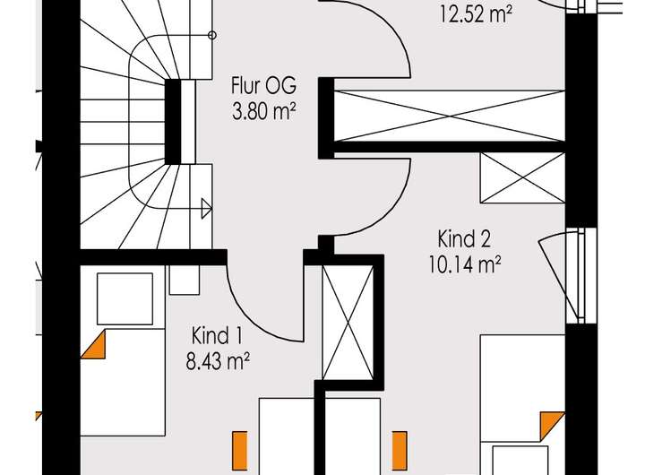 Im 1. Obergeschoss sind zum Elternschlafzimmer zwei Kinderzimmer und ein modernes Badezimmer mit Dusche und natürlich einem Fenster zur optimalen Belüftung.