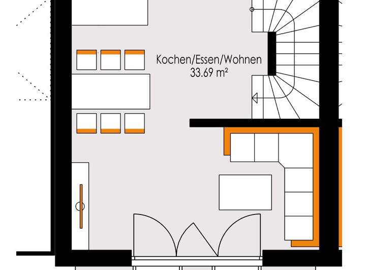 Die offene Küche und der Essbereich ergänzen den Wohnraum im Erdgeschoss und entsprechen den Anforderungen an modernes Wohnen.