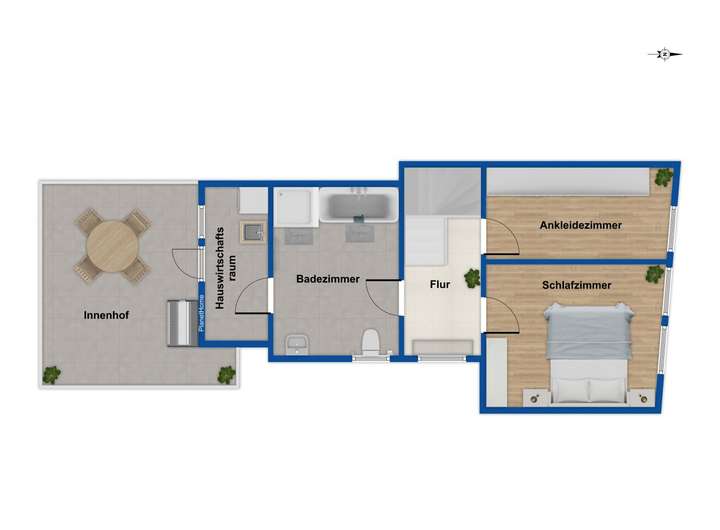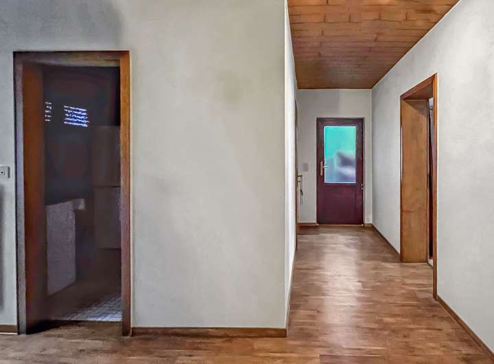 Ein besonderes Merkmal der Immobilie ist die Verbindung der beiden Häuser über einen kleinen, überdachten Innenhof auf der ersten Etage. Diese Gestaltung schafft eine direkte Verbindung zwischen den beiden Gebäuden und ermöglicht eine flexible Nutzung – sei es überdachter Sitzbereich oder geschützter Zugang zwischen den Häusern.