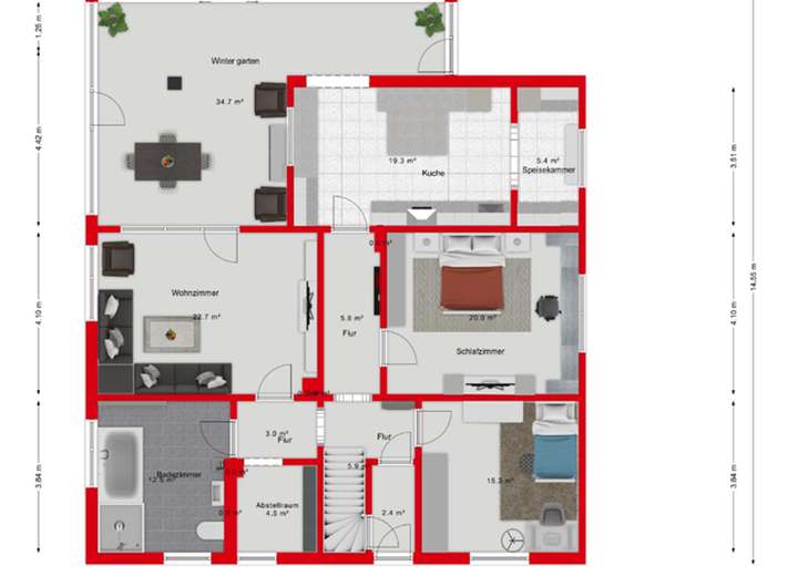 • Bodenbeläge: Wintergarten gefliest, Laminat in drei Zimmern, Parkett in der Küche