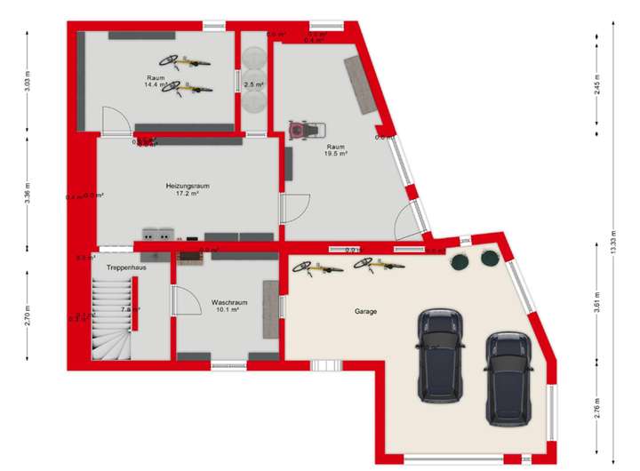 • Garage und Terrasse: Die 2er-Garage mit großer Terrasse darüber und der vordere Kellerraum sind sanierungsbedürftig.