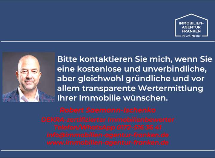 Die Angebote der Immobilien-Agentur Franken erfolgen freibleibend und unverbindlich. Irrtum und Zwischenverkauf bleiben vorbehalten. Den objektbezogenen Angaben liegen die uns erteilten Auskünfte und Informationen, insbesondere des Verkäufers zugrunde. Eine Haftung für deren Richtigkeit und Vollständigkeit übernehmen weder der Verkäufer noch die Immobilien-Agentur Franken. Es obliegt daher dem Kunden, die Objektinformationen auf ihre Richtigkeit zu prüfen.