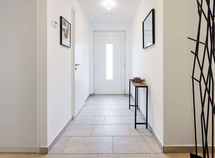 Ein praktisches Vordach schützt den Hauseingang vor Regen. Briefkasten und Klingelanlage sind aus wertigem Edelstahl, die Außenbeleuchtung ist harmonisch darauf abgestimmt. Für einen schnellen Start in die Gartensaison ist der Terrassenbelag bereits verlegt. Der eigene Garten lädt zum Entspannen ein, während die Kinder ungestört spielen können.