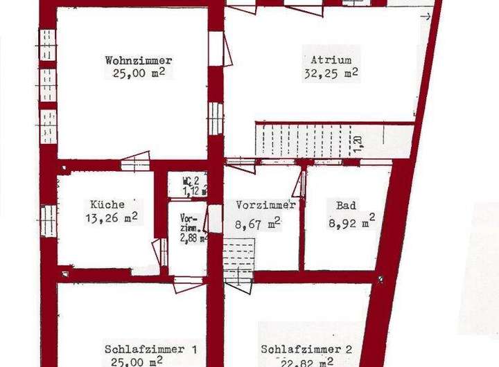 2 Schlafzimmer 25m2 und 23m2 , neue Küche 13m2 , ein Wohnzimmer 25m2 , ein weiters (Gäste-)Zimmer 14m2 und das Bad mit Wanne , Dusche und zwei Fenster, und separates WC.