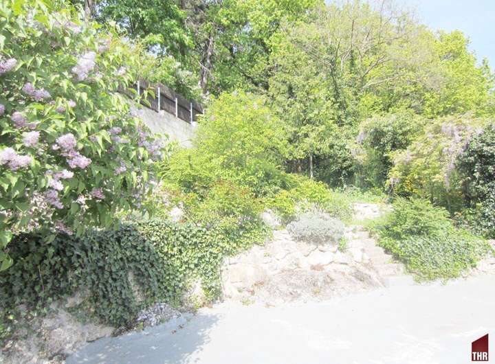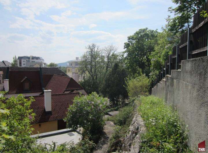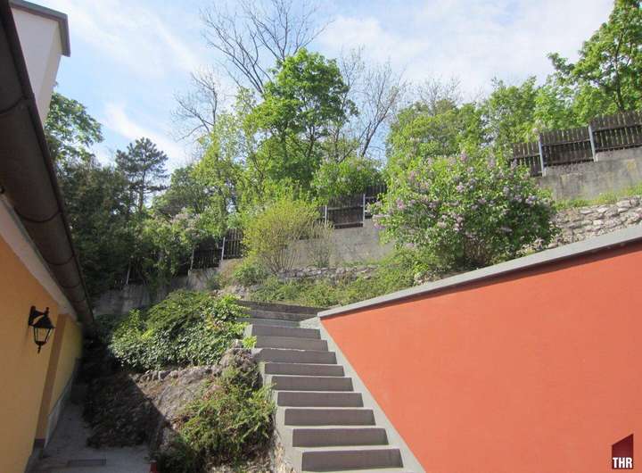 Vom Atrium über einige Stufen, gelangen Sie auf die Gartenterrasse , von allen Seiten die Sonne und im Norden der Wald, Blick zum Vöslauer Harzberg.