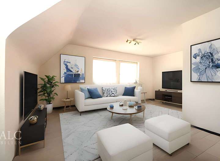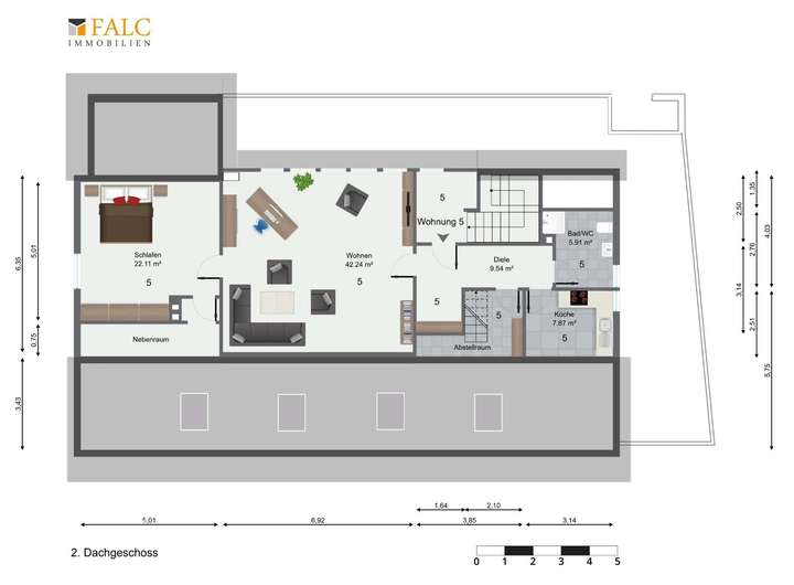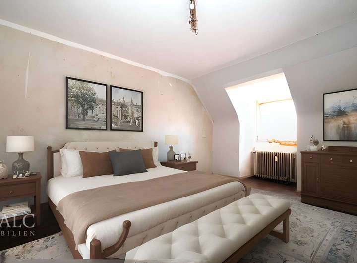 Die Wohnung Nr. 5 befindet sich im 2. Dachgeschoss und lässt sich am Ende des Flurgangs vom 1. Dachgeschoss durch einen eigenen Eingang sep. betreten. Hier befindet sich ein großzügiges Wohnzimmer von über 40 m², ein Tageslicht-Bad, eine feine Küche sowie ein Schlafzimmer mit zusätzlichem Neben- und Abstellraum. Zu dieser Wohnung gehört noch die Dachbühne dazu, die als weitere Lagerungsfläche dient und vom Abstellraum durch einen kurzen Treppenaufgang schnell zu erreichen ist.