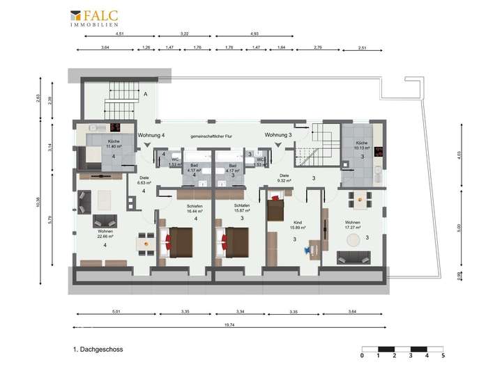 Durchlaufen Sie das Treppenhaus ins 1. Dachgeschoss werden Sie ebenfalls durch 2 weitere Wohneinheiten begrüßt. Die Wohnung Nr. 4 umfasst eine 2-Zimmer-Wohnung mit eigenem Badezimmer, sep. WC und einer Küche, wobei die Wohnung Nr. 3 am Ende des Flures als eine 3-Zimmer-Wohnung hervorgeht. Durch die vielseitigen Fensterfronten kommt in diesen 2 Wohneinheiten ausreichend viel Tageslicht herein.