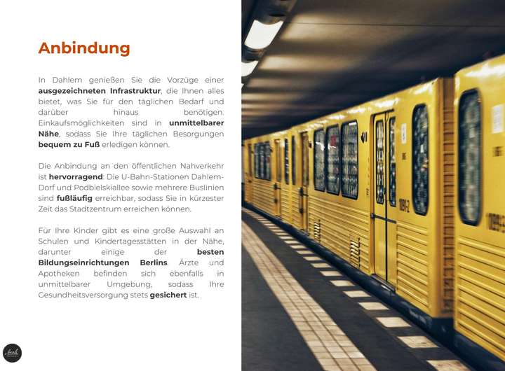 Die Anbindung an den öffentlichen Nahverkehr ist hervorragend: Die U-Bahn-Stationen Dahlem-Dorf und Podbielskiallee sowie mehrere Buslinien sind fußläufig erreichbar, sodass Sie in kürzester Zeit das Stadtzentrum erreichen können. Für Ihre Kinder gibt es eine große Auswahl an Schulen und Kindertagesstätten in der Nähe, darunter einige der besten Bildungseinrichtungen Berlins. Ärzte und Apotheken befinden sich ebenfalls in unmittelbarer Umgebung, sodass Ihre Gesundheitsversorgung stets gesichert ist.