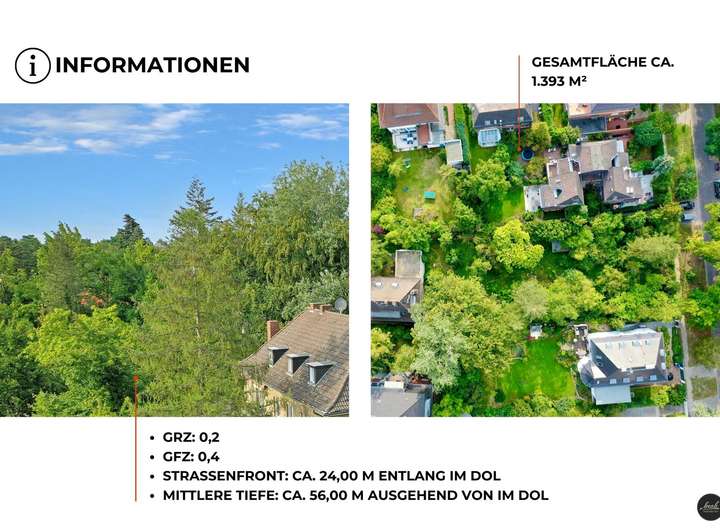 Die 24 Meter breite Straßenfront und die Tiefe von rund 56 Metern geben Ihrer Fantasie Raum: Ob stilvolle Stadtvilla, modernes Architektenhaus oder ein Rückzugsort mit Atelier, hier können Sie Ihre Wohnträume Wirklichkeit werden lassen. Dank einer GRZ von 0,2 und einer GFZ von 0,4 ist eine großzügige Bebauung möglich.