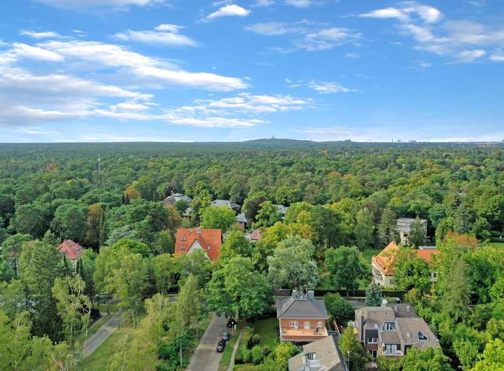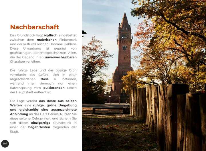 Das Grundstück liegt idyllisch eingebettet zwischen dem malerischen Finkenpark und der kulturell reichen Domäne Dahlem. Diese Umgebung ist geprägt von großflächigen, denkmalgeschützten Villen, die der Gegend ihren unverwechselbaren Charakter verleihen. Die ruhige Lage und das üppige Grün vermitteln das Gefühl, sich in einer abgeschiedenen Oase zu befinden, während man dennoch nur einen Katzensprung vom pulsierenden Leben der Hauptstadt entfernt ist.