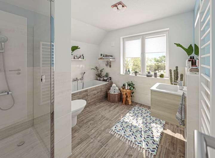 Das großzügige Haus mit dem schönen Satteldach überzeugt mit viel Platz und einem variablen Grundriss. Das Wohnzimmer schenkt genügend Raum zur Erholung, die sich anfügende Essecke wird schnell zum gemütlichen Familienmittelpunkt mit direktem Zugang zur Küche. Die hohen Fenster fangen das Tageslicht besonders gut ein. Jeder Raum im Haus wirkt offen und freundlich. Ein Arbeits- oder Kinderzimmer und das Gäste-WC runden das Erdgeschoss perfekt ab.