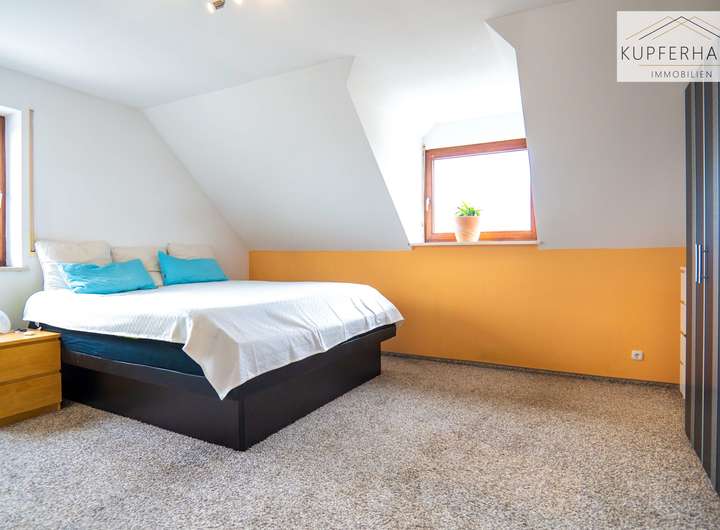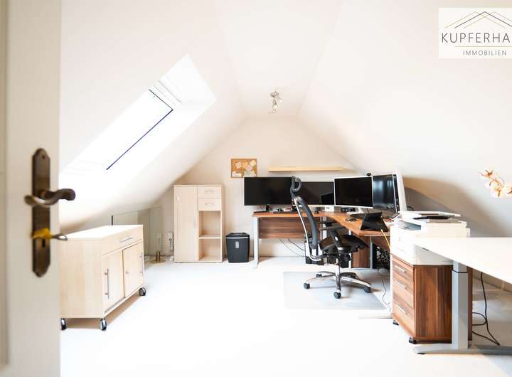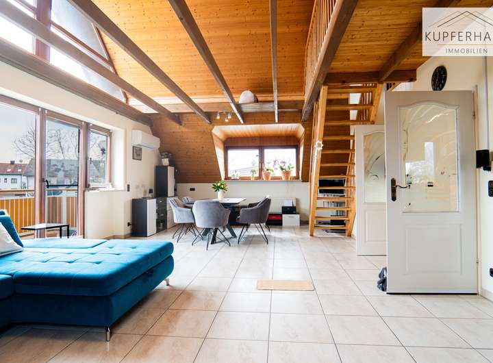 Einen Stock höher präsentiert sich die Dachgeschosswohnung mit einer Fläche von ca. 117 m², einer charmanten Galerie und einem wunderbaren Ausblick vom Balkon aus. Mit vier Zimmern ist sie besonders attraktiv für Familien mit mehreren Kindern und dem Bedarf nach einem Home Office Raum.