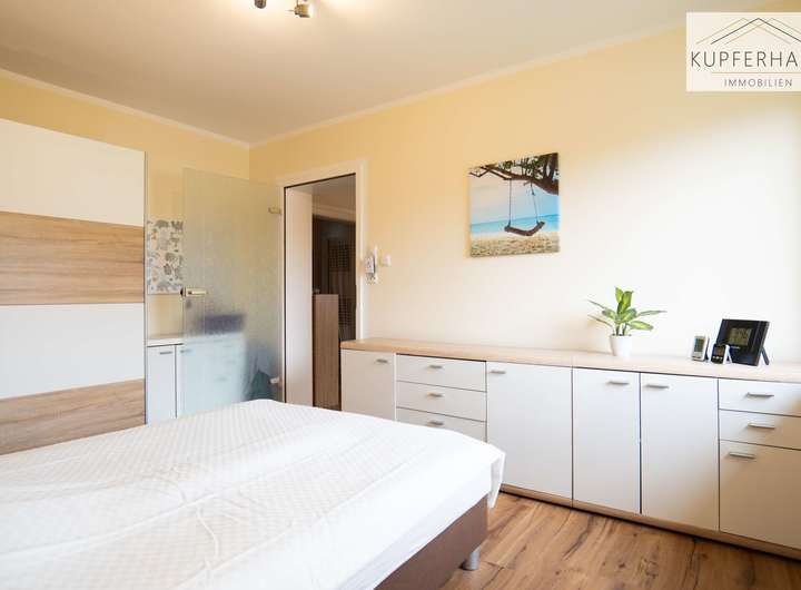Im Obergeschoss erwarten Sie zwei lichtdurchflutete Wohnungen, die bei Bedarf leicht zu einer großzügigen Einheit kombiniert werden können. Gemeinsam bieten die beiden Wohnungen etwa 127 m² Wohnfläche, einen überdachten und großen Balkon und insgesamt drei Schlafzimmer. Familien mit Kindern oder Paare mit Wunsch nach einem Home Office Raum werden sich hier sicher wohl fühlen.