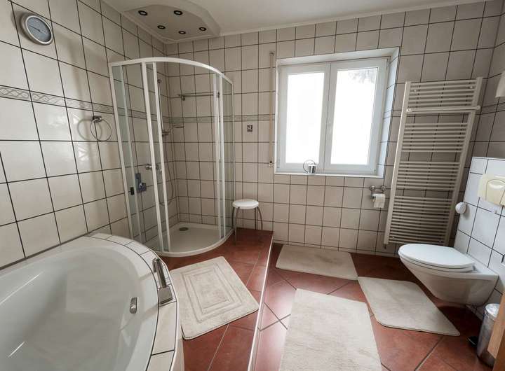 Die Immobilie verfügt über zwei Badezimmern, die mit einer Badewanne, einer Dusche und einem Fenster ausgestattet ist. Zudem ist eine Gästetoilette vorhanden. In der Küche ist bereits eine Einbauküche eingebaut. Rollläden sind an den Fenstern angebracht. Die Bodenbeläge in der Immobilie bestehen aus Fliesen, Teppichboden, Dielen und Laminat. Die Qualität der Ausstattung wird als einfach eingestuft.