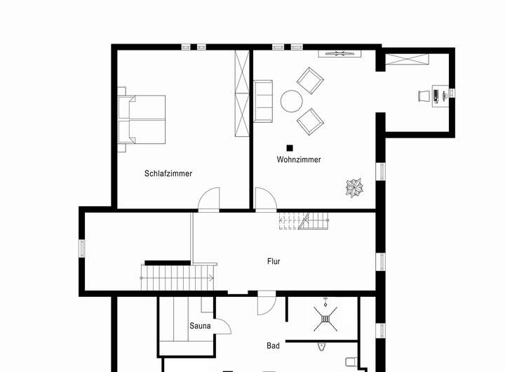 Im Dachgeschoss des Hauses befinden sich zwei weitere Zimmer, die Sauna und ein Duschbad.