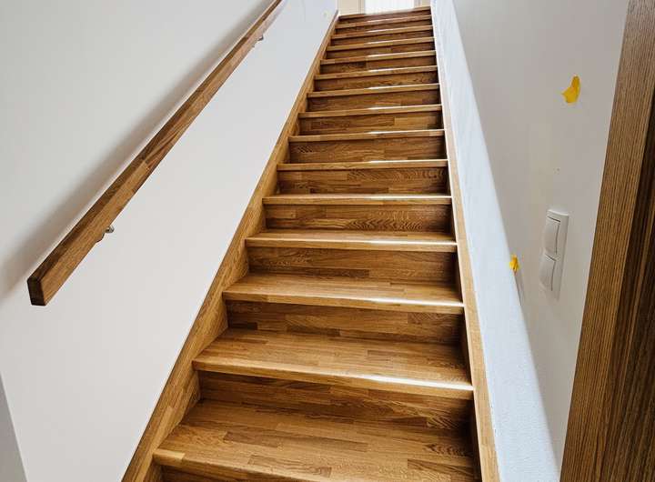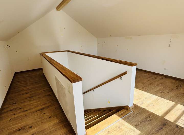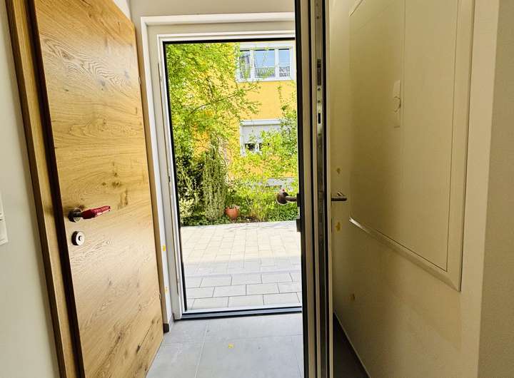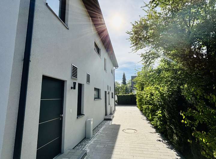 offener Wohn- und Essbereich mit einer 4 Meter breiten Hebeschiebetüre zum Garten, EG komplett mit hochwertigen Fliesen belegt, gerade Eichenholztreppen zum OG und DG, Wärmepumpe ohne Außengerät und zusätzliche Wasserenthärtungsanlage, Vorbereitung zum Einbau einer PV-Anlage vorhanden, Holz/Alu Fenster mit 3-fach Verglasung, elektrische Rollläden, Walk-in Dusche und Badewanne im OG, lichtdurchflutetes Studio im DG