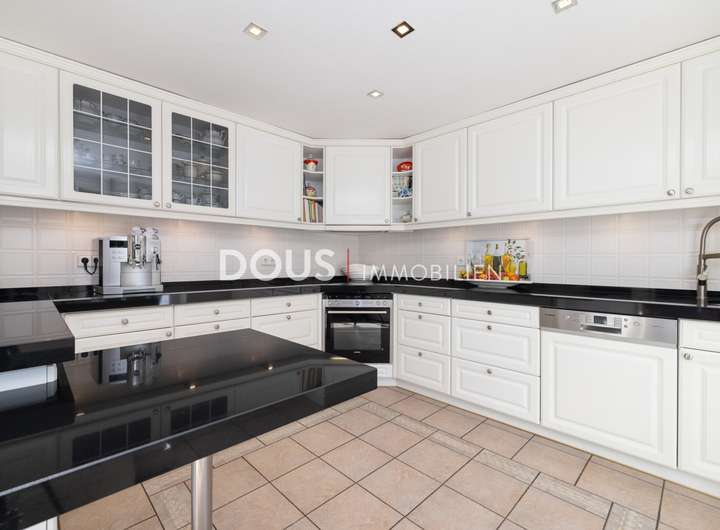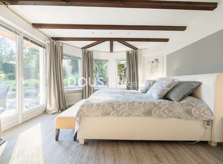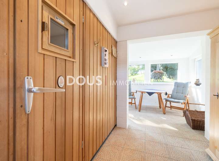 Im Erdgeschoss erwarten Sie großzügige Wohn- und Essbereiche mit direkten Zugängen auf die sehr große Süd-West-Sonnenterrasse mit Außenpool und einem Spa-Bereich mit Sauna, Duschen und einem Ruheraum.