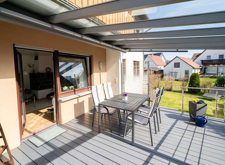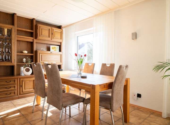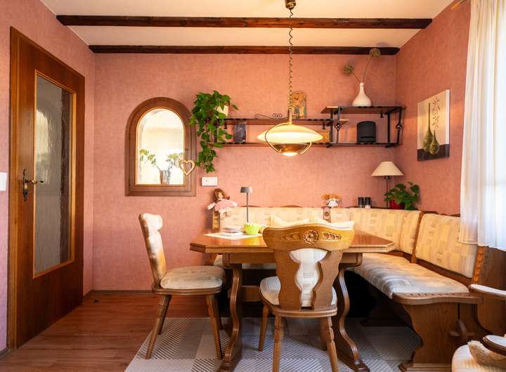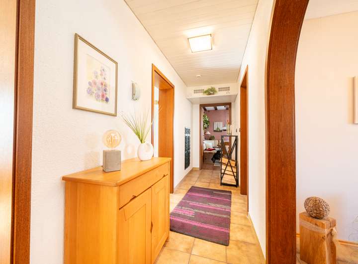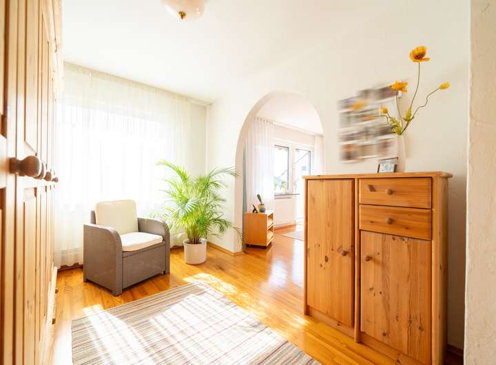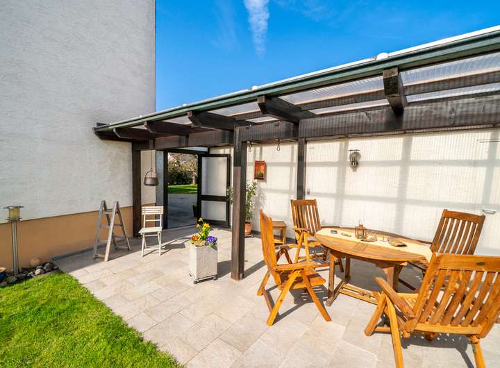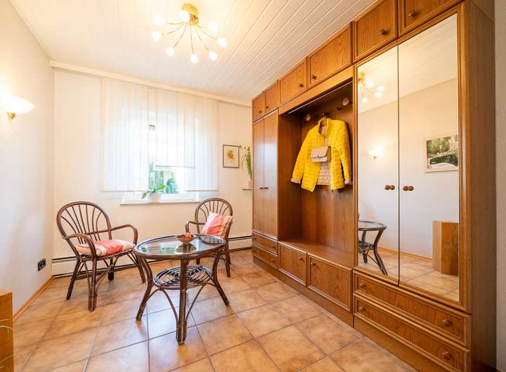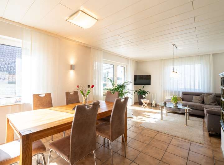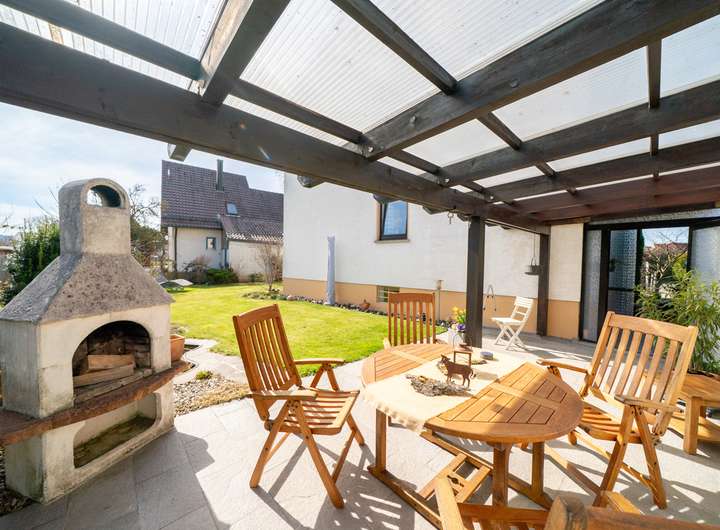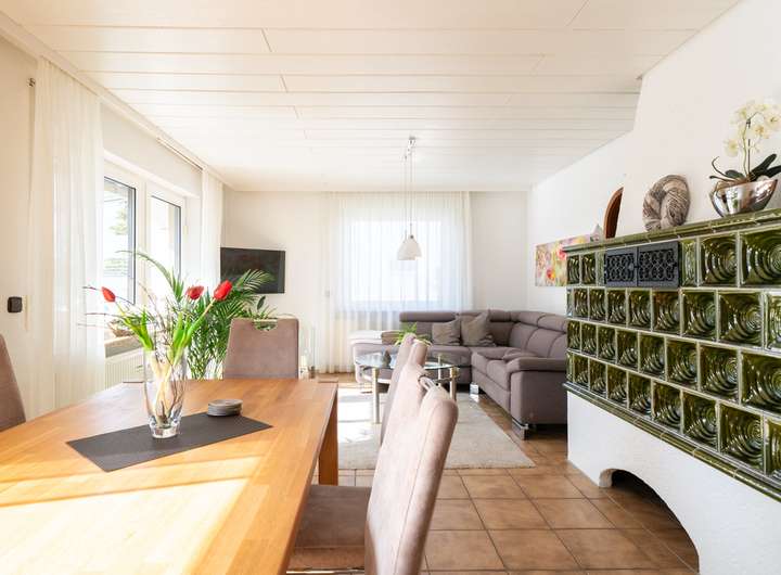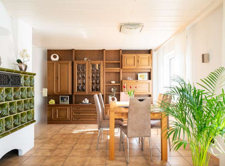 Das Erdgeschoss empfängt Sie mit einem großen Garderobenbereich. Hier haben Sie reichlich Platz und können in aller Ruhe erst einmal ankommen. Gleich gegenüber befindet sich ein geräumiges Büro - perfekt für die heutigen Möglichkeiten im Homeoffice. Gleich neben dem modernen Badezimmer mit Dusche wartet die Küche auf Sie. Hier können Sie ihren Liebsten Gaumenfreuden zubereiten. Das schöne - hier können Sie auch gleich gemeinsam Abendessen, denn hier gibt es genügend Platz für einen Tisch oder eine Eckbank. Ein paar Schritte weiter wartet das Herzstück - der lichtdurchflutete Wohnbereich, der zum Verweilen und Genießen einlädt und gekonnt einen großen Tisch, wie auch den Kachelofen in Szene zu setzen weiß. Der Ofen sorgt an kalten Tagen für behagliche Wärme, die Sie nicht mehr missen möchten. Von hier aus betreten Sie auch gleich die neue Terrasse. Stellen Sie sich eine Oase vor, in der sich modernes Design und familiäre Geborgenheit harmonisch vereinen: Eine vor wenigen Jahren liebevoll erneuerte Terrasse mit eleganter Glasüberdachung, die das Licht hereinlässt und gleichzeitig Schutz vor Wind und Wetter bietet.