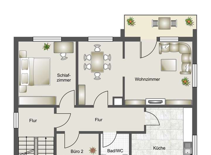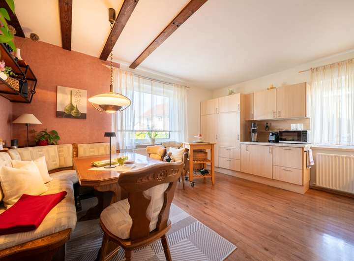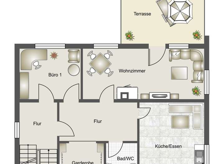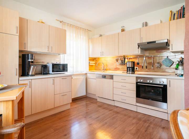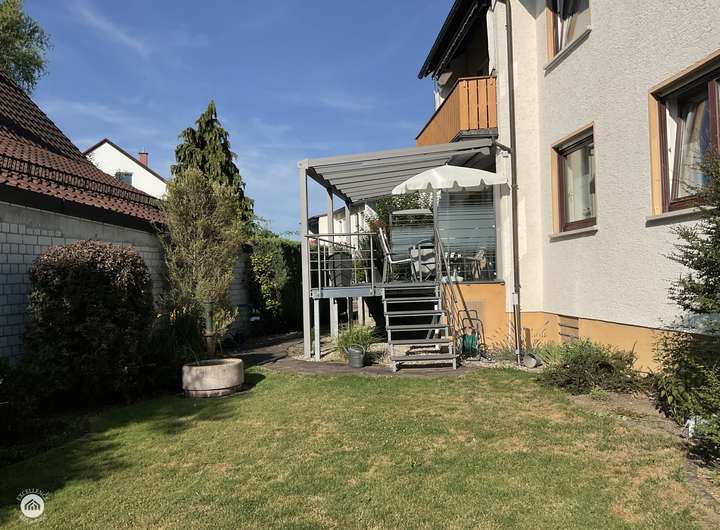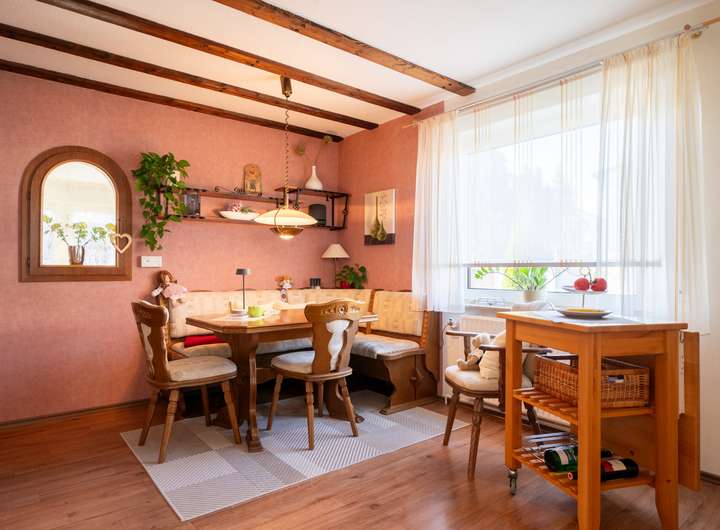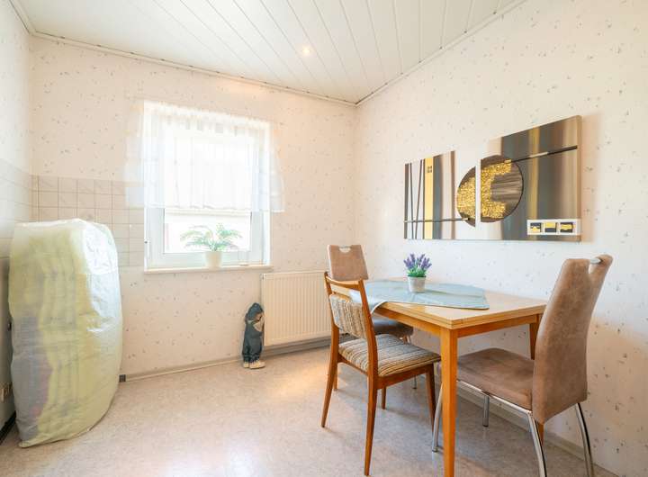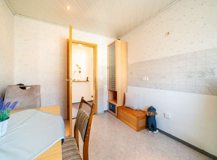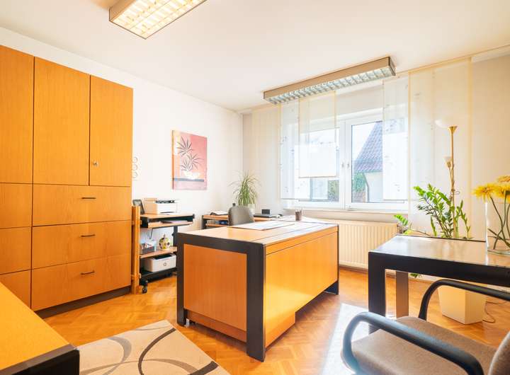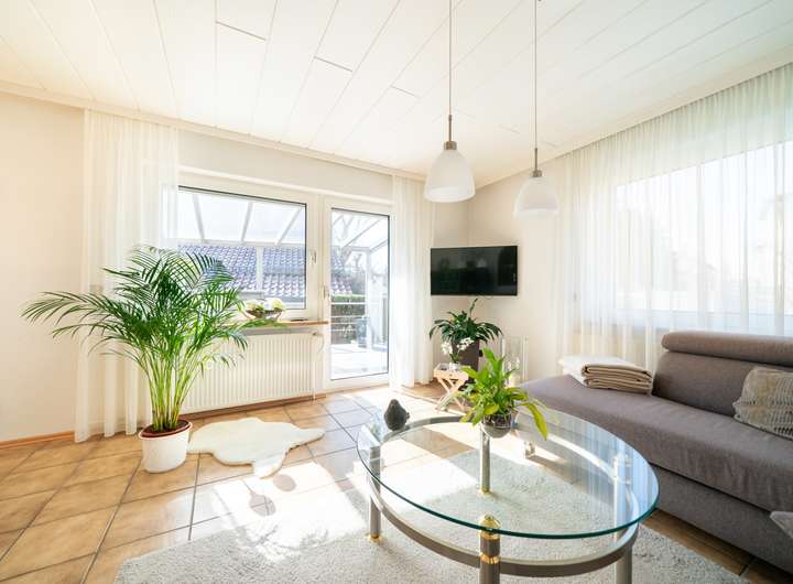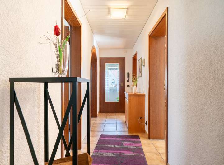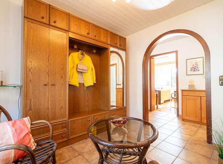 Das Erdgeschoss empfängt Sie mit einem großen Garderobenbereich. Hier haben Sie reichlich Platz und können in aller Ruhe erst einmal ankommen. Gleich gegenüber befindet sich ein geräumiges Büro - perfekt für die heutigen Möglichkeiten im Homeoffice. Gleich neben dem modernen Badezimmer mit Dusche wartet die Küche auf Sie. Hier können Sie ihren Liebsten Gaumenfreuden zubereiten. Das schöne - hier können Sie auch gleich gemeinsam Abendessen, denn hier gibt es genügend Platz für einen Tisch oder eine Eckbank. Ein paar Schritte weiter wartet das Herzstück - der lichtdurchflutete Wohnbereich, der zum Verweilen und Genießen einlädt und gekonnt einen großen Tisch, wie auch den Kachelofen in Szene zu setzen weiß. Der Ofen sorgt an kalten Tagen für behagliche Wärme, die Sie nicht mehr missen möchten. Von hier aus betreten Sie auch gleich die neue Terrasse. Stellen Sie sich eine Oase vor, in der sich modernes Design und familiäre Geborgenheit harmonisch vereinen: Eine vor wenigen Jahren liebevoll erneuerte Terrasse mit eleganter Glasüberdachung, die das Licht hereinlässt und gleichzeitig Schutz vor Wind und Wetter bietet.