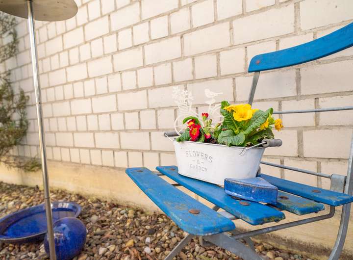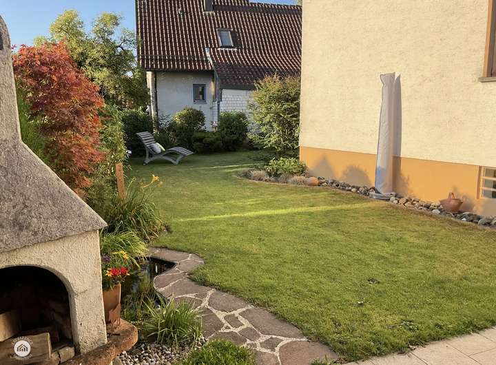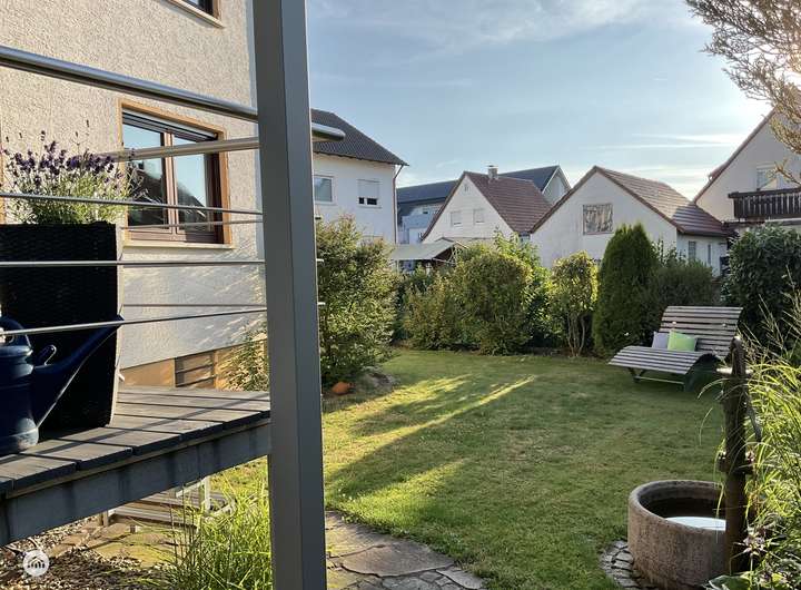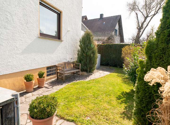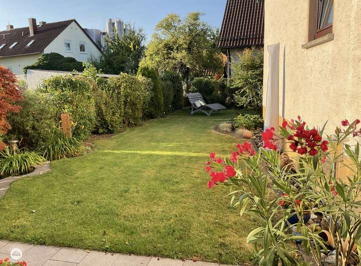 Von hier aus öffnet sich der Zugang zum eigenen Gartenparadies, das jedem Familienmitglied unzählige Möglichkeiten bietet. Für die Kleinen gibt es weitläufige Flächen zum Toben und Spielen, während Eltern sich entspannt in gemütlichen Ecken zurücklehnen können – sei es bei einem erholsamen Sonnenbad oder einem stillen Moment der Ruhe. Liebevoll angelegte Blumenbeete laden dazu ein die Natur in ihrer vollen Pracht zu genießen.