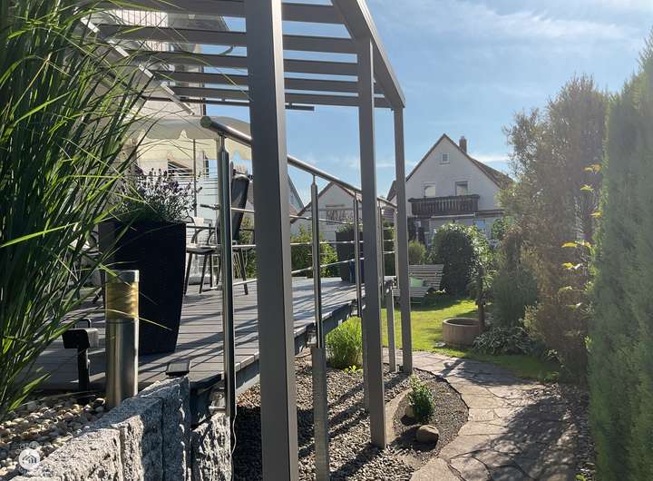 Ein Highlight dieses Rückzugsortes ist die Pergola, die dazu einlädt, den Tag bei einem kühlen Getränk oder einem guten Gespräch ausklingen zu lassen. Gleich daneben sorgt ein Grill für gesellige Stunden im Freien, bei denen kulinarische Genüsse und gemeinsame Erlebnisse in den Mittelpunkt rücken.