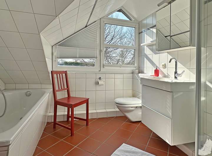 Die obere Etage empfängt Sie dank der großen bodentiefen Fenster der Zimmer freundlich und hell. Hier erwarten Sie zwei Schlafzimmer, ebenfalls mit Wasserblick sowie das Hauptbadezimmer mit Badewanne und Dusche.