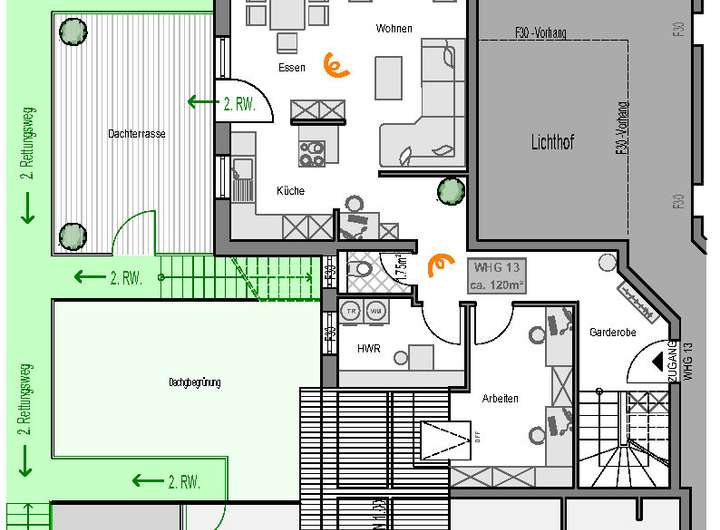 Moderne Ausstattung, u.a. mit Aufzug, 3-fach-Isolierverglasung, Rollläden über 2,5 m Fensterfläche werden mit elektrischem Antrieb ausgeführt. Die Heizungsanlage wird vollautomatisch nach Außentemperatur geregelt, sämtliche Räume mit Fußbodenheizung. Bodenebene Duschen, Wohn- und Essbereich mit Echtholzparkettboden, Balkon oder Dachterrasse u.v.m. Tiefgaragenstellplätze und Kellerräume im Untergeschoss.