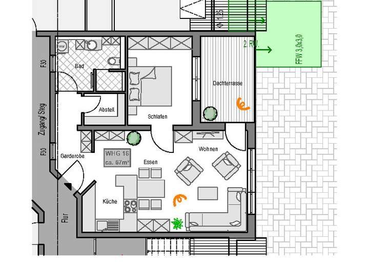 Moderne Ausstattung, u.a. mit Aufzug, 3-fach-Isolierverglasung, Rollläden über 2,5 m Fensterfläche werden mit elektrischem Antrieb ausgeführt. Die Heizungsanlage wird vollautomatisch nach Außentemperatur geregelt, sämtliche Räume mit Fußbodenheizung. Bodenebene Duschen, Wohn- und Essbereich mit Echtholzparkettboden, Balkon oder Dachterrasse u.v.m. Tiefgaragenstellplätze und Kellerräume im Untergeschoss.