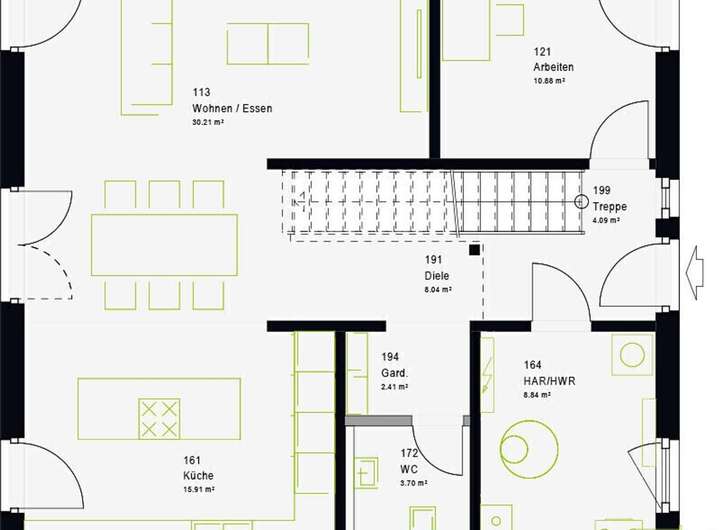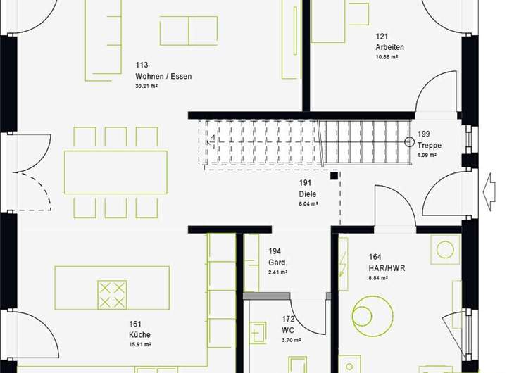 Das Haus besticht durch seine selbstbewusste Ausstrahlung und ist ideal für Familien mit dem Wunsch nach viel Freiraum. Doch vor allem durch seine individuellen Ausbaumöglichkeiten gewinnt das Haus an schmeichelnder Größe. Hier können Sie Ihre eigenen Ideen verwirklichen und Ihr Traumhaus gestalten.